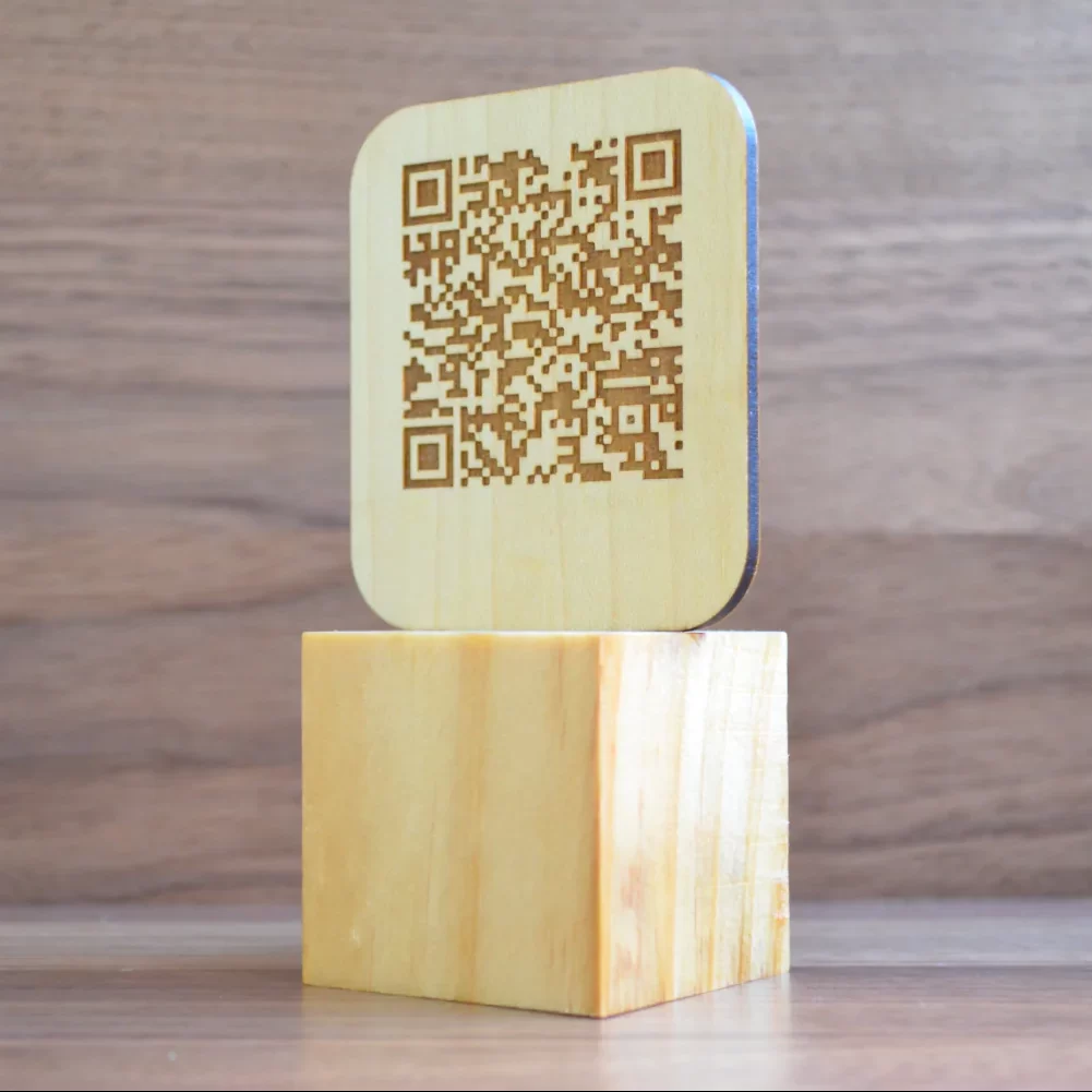 Placas QR grabadas en madera con un soporte con forma de cubo, que opcionalmente puede llevar el grabado del logo del negocio. Las placas tienen un espesor de 4 mm y se graban en ambas caras.