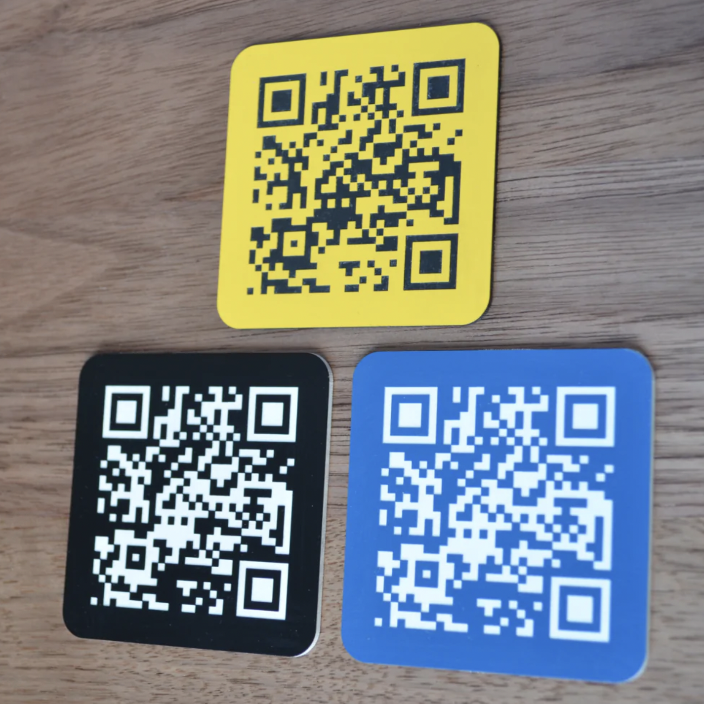 Placas QR de acrílico plástico (6×6 cm), confeccionadas en un material duradero apto tanto para aplicaciones en interiores como exteriores. Ofrecemos tres opciones de colores: